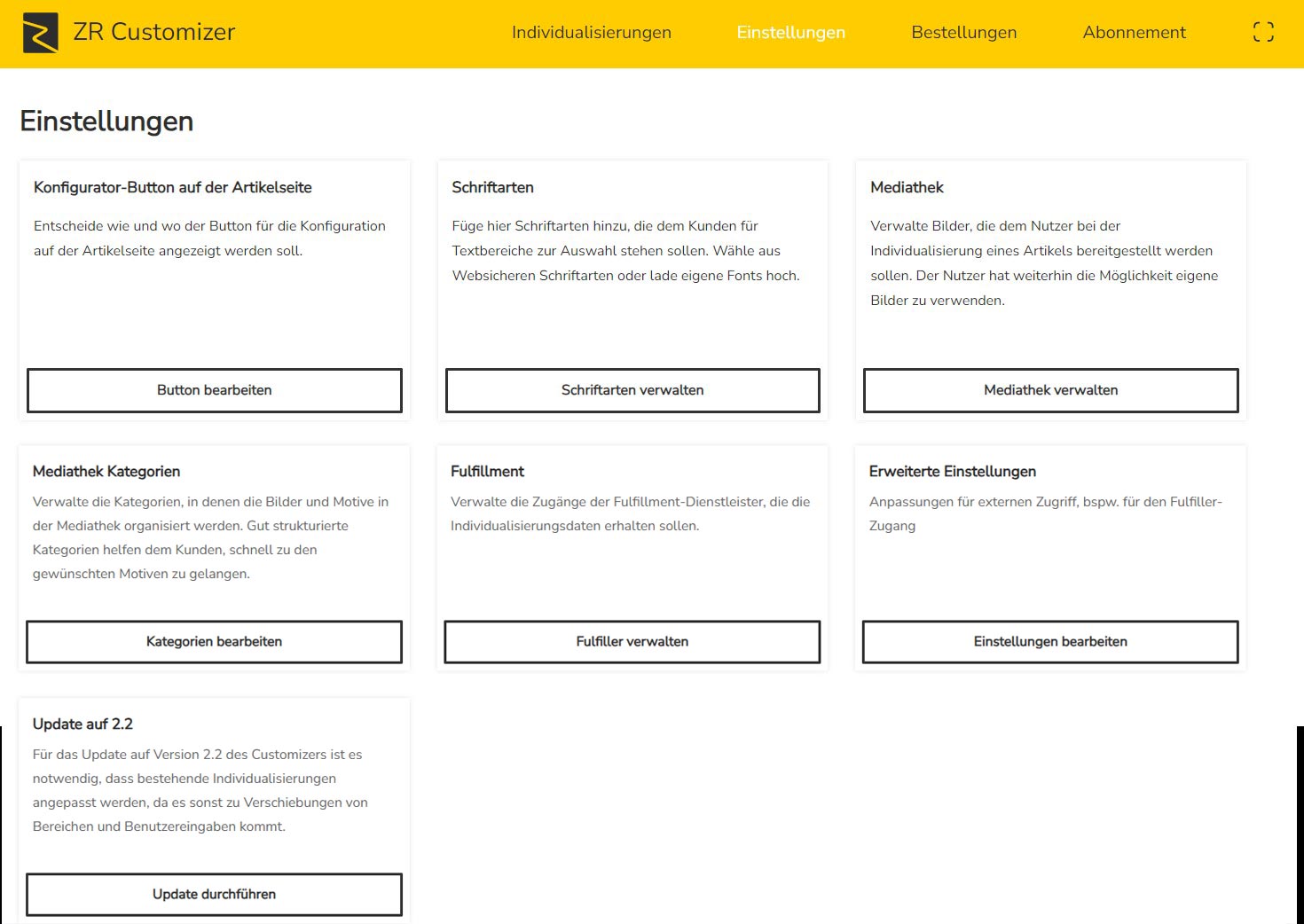Unter „Update auf 2.2“ finden Sie die Option, die Koordinaten der angelegten Elemente aller Individualisierungen zu updaten, falls Sie ZR Product Customizer vor der Version 2.2.0 genutzt haben. Hier erscheint dann eine Auflistung zu aktualisierender Individualisierungen, Bereiche und Benutzereingaben. Mit Klick auf die Schaltfläche „Daten migrieren“ starten Sie den Aktualisierungsprozess, der nur wenige Sekunden dauern sollte.