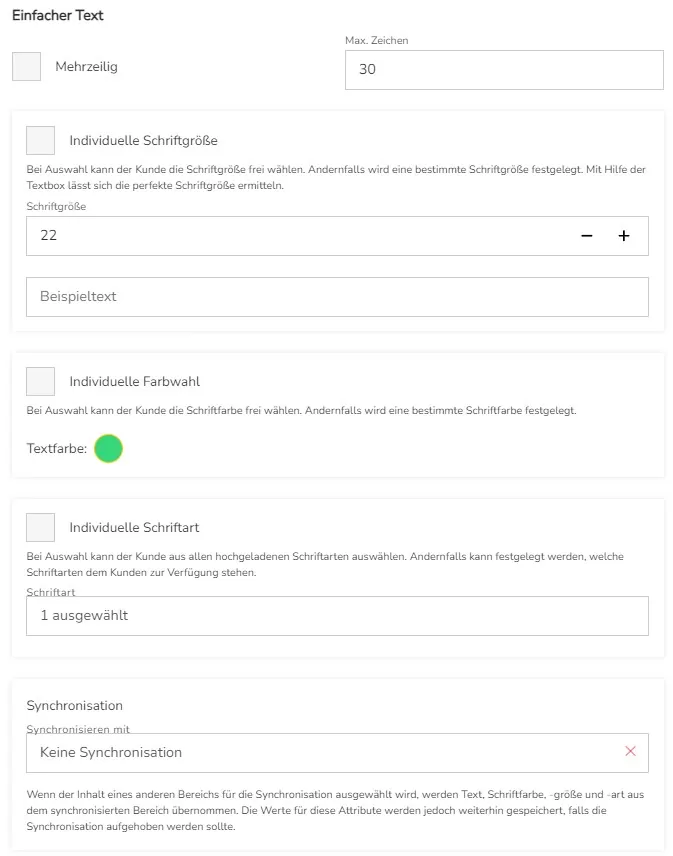 Hier können Sie festlegen, ob sich der von Kunde eingegebene Text mit anderen Textfeldern synchronisieren soll, also der Text gleichzeitig in mehrere Textfelder eingegeben werden soll. Das ist z.B. Praktisch, wenn Sie ein Set aus Artikeln anbieten, in dem jeder Artikel, die gleiche Aufschrift bekommen soll